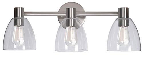 - INDUSTRIAL STYLE: Representing the perfect balance of loft living and modern industrial style, this vanity features a sleek brushed steel finish and 3 clear blown glass shades to fill your master bathroom with plenty of light. The clear glass shades allow for uninterrupted multidirectional light that’s fantastic for situations that call for large amounts of light, such as bathroom installation over a mirror and pedestal sink so you can fix your makeup, style your hair, and jumpstart your morning routine.